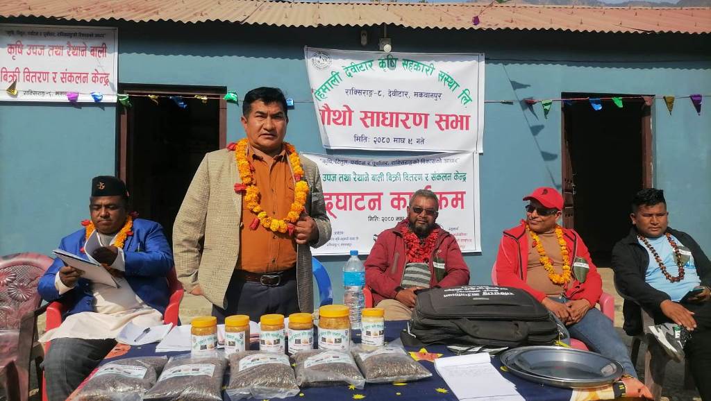 मकवानपुर । राक्सिराङ्गको हिमाली देविटार कृषि सहकारी संस्था लिमिटेडले स्थानीय उत्पादन कृषि उपज तथा रैथाने बाली बिक्री वितरण र संकलन केन्द्र स्थापना गरेको छ । संस्थाको चौथो वार्षिक साधारण सभाको अवसरमा मंगलबार गाउँपालिका अध्यक्ष राजकुमार मल्लले उक्त केन्द्रको उद्घाटन गर्नुभएको हो।